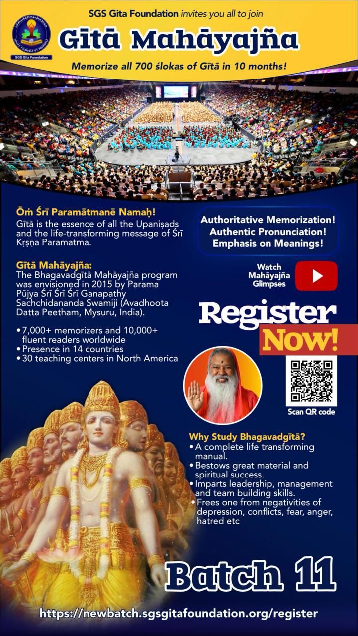 Parama Pūjya Śrī Swamiji envisioned the Gītā Mahāyajña program to empower children, youth & adults with the life transforming teachings from the Bhagavad Gītā. This vision of HIS gave birth to the SGS Gītā Foundation.